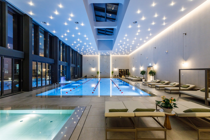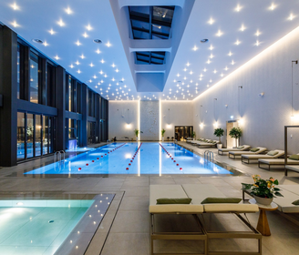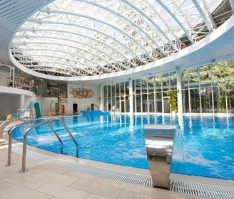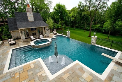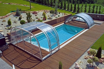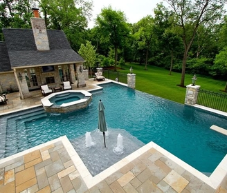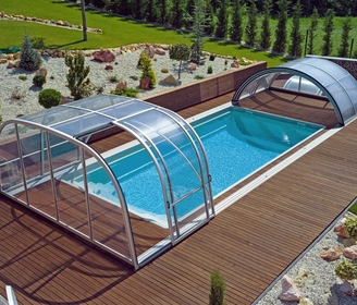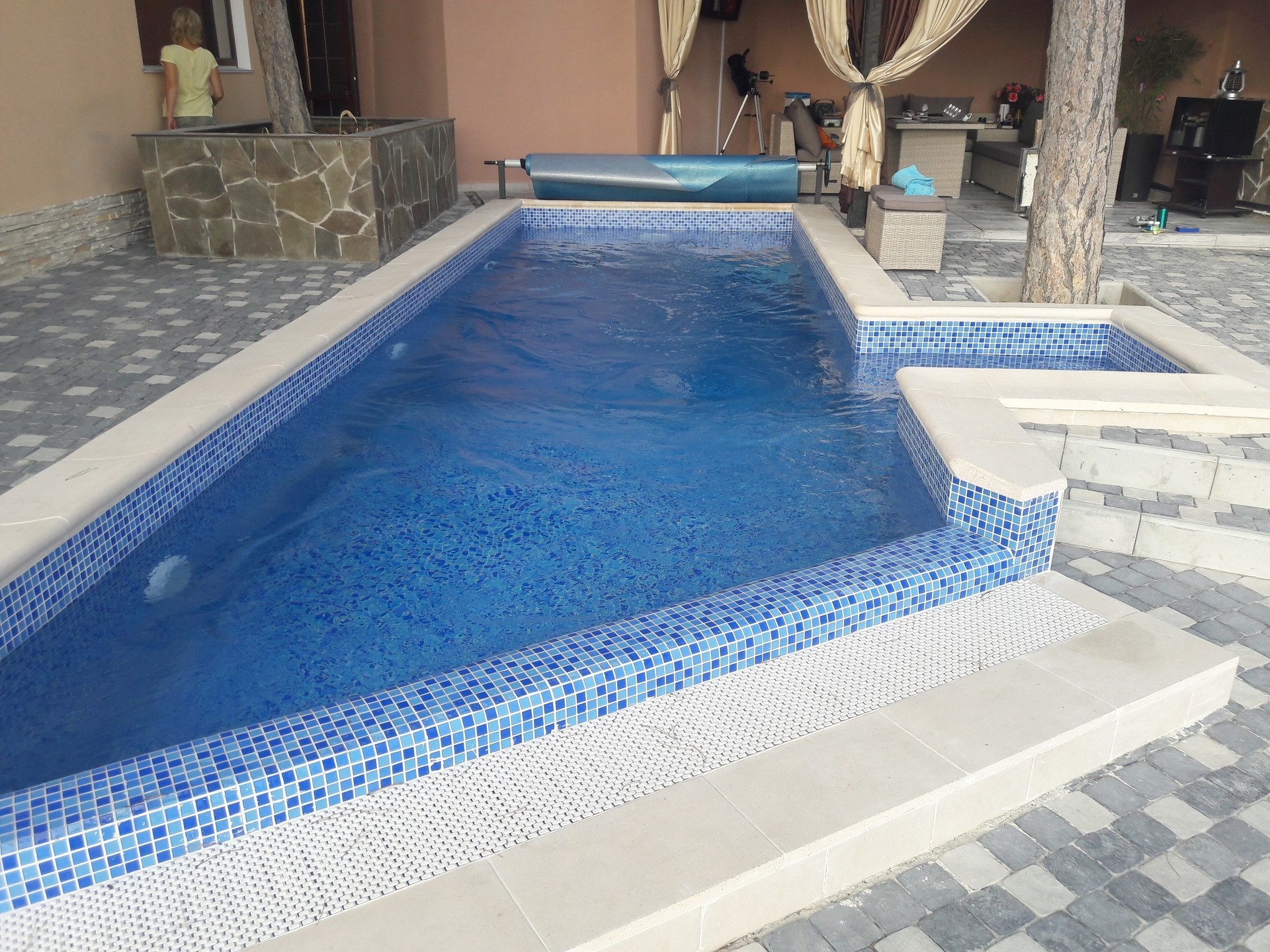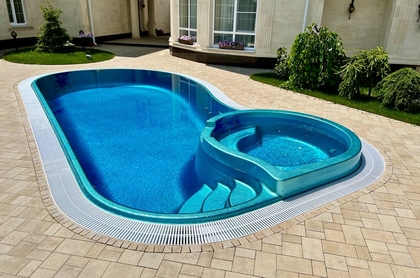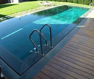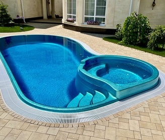 - Переливной бассейн (перел.): в переливном бассейне основной забор воды происходит через переливной лоток который расположен за бортом бассейна, гладь воды находится в ровень с бортом бассейна и переливаясь через борт создаёт ощущение бесконечности, органично сливаясь с прилегающей территорией. Стоимость устройства переливного бассейна дороже чем скиммерного, за счёт необходимости устройства переливного лотка, компенсационной ёмкости и более сложного инженерного решения водоподготовки.