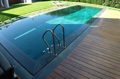 - Скиммерный бассейн (ским.): в основном бассейны данного типа для частного использования, для дома или дачи, коттеджа, глэмпинга, на семью или две, при саунах и банях, в виде купелей или водоёмов. Фильтрация воды в таком бассейне происходит через заборное устройство в стене бассейна, которое и называется — Скиммер, так же забор происходит через донный (придонный) забор, но так как 75% загрязнений находится в верхних 15 см. воды то скиммер является основным заборным устройством. Вода в скиммерных бассейнах находится ниже борт бассейна, стоимость устройства по сравнению с другими типами бассейнов самая минимальная и обслуживание не требует особых усилий.